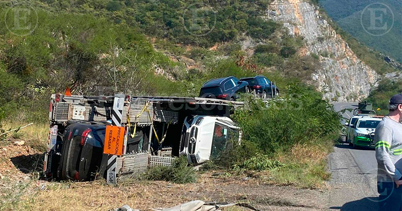Vuelca nodriza en la Rumbo nuevo; transportaba camionetas de lujo