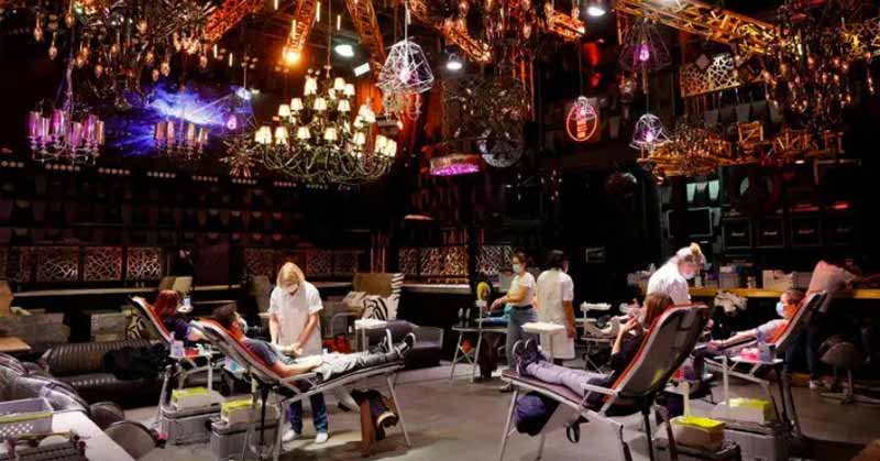 En el club nocturno, mientras las enfermeras que insertan agujas mientras suenan canciones de Queen, los Bee Gees y Michael Jackson