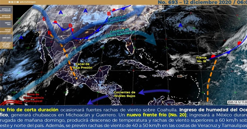 Finalmente, un nuevo frente frío (No. 20) y su masa de aire polar asociada, ingresarán durante la madrugada del domingo sobre los estados fronterizos del noroeste y norte del país, en interacción con la corriente en chorro, ocasionarán descenso de temperatura y fuertes rachas de viento sobre Baja California, Sonora y Chihuahua.