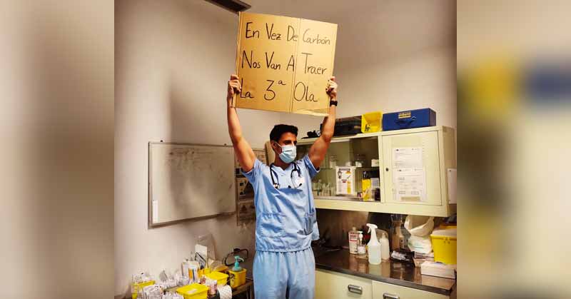 El sanitario recurre a un cartel de cartón para transmitir sus recomendaciones. En el último mensaje hace referencia a la cena familiar por las fiestas navideña.