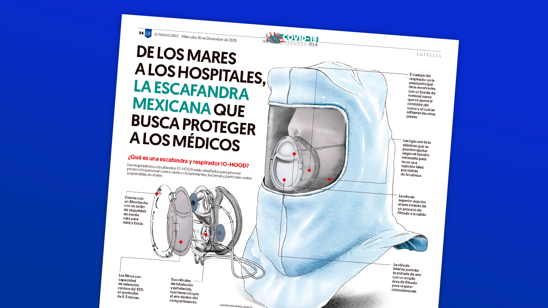 Ante la necesidad de proteger de una forma inmediata y eficaz frente a la pandemia del SARS-CoV-2 a los profesionales de la salud, el mexicano Alejandro Cortina diseñó una escafandra, la cual ya recibió autorización desde el pasado 11 de diciembre por parte de Comisión Federal para la Protección contra Riesgos Sanitarios (Cofepris) para su comercialización.