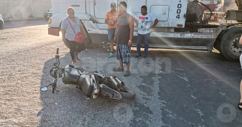 La pesada unidad da vuelta en ‘U’ y le cierra el paso; motorista está grave