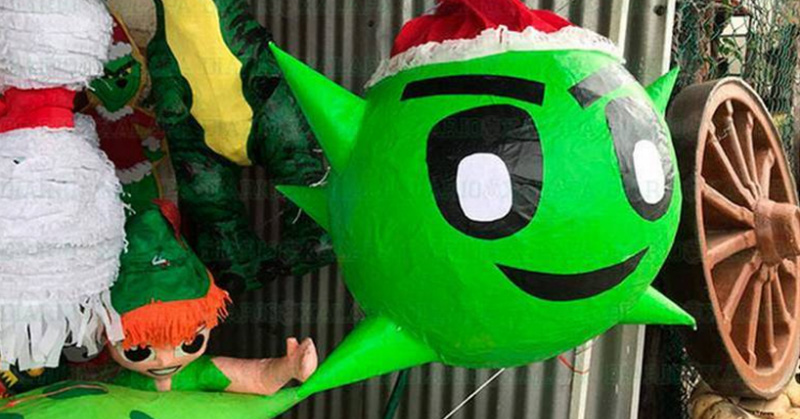 La piñata del “covid navideño” es una esfera verde con picos, formada principalmente de cartón