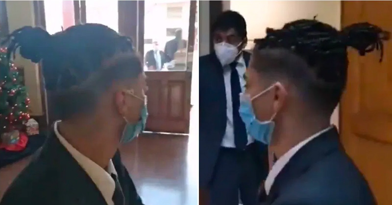 Durante la grabación, de poco menos de dos minutos, se puede ver cómo el padre -que también se llama Jaime- se enfrenta al profesor que no le dio acceso a su hijo. “Él es quien discrimina a mi hijo por el corte de pelo, para que sepan quién es“, dice el protagonista del video e incluso le solicita al docente que diga su nombre.