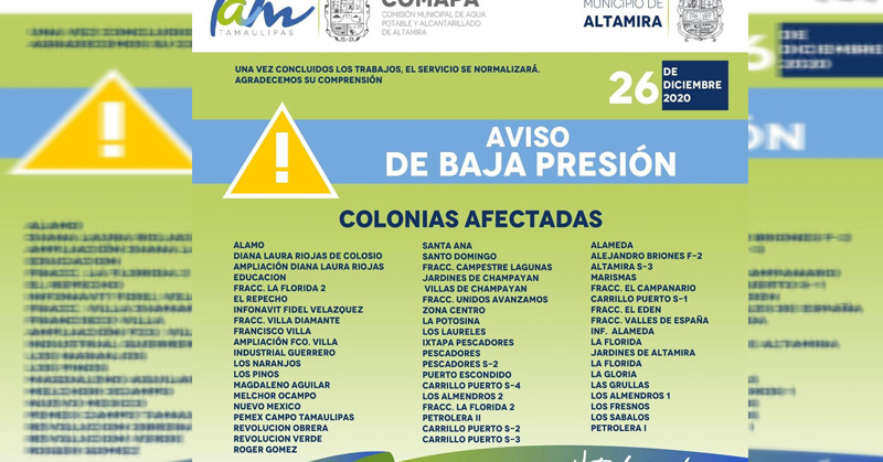 Durante hoy sábado informa la Comapa Altamira Altamira