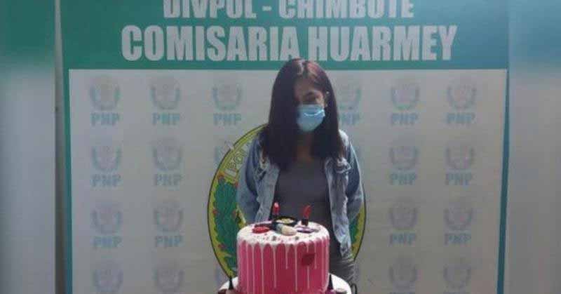 En una foto tomada por los elementos de seguridad al interior de la Comisaría de Huarmey, Perú, la joven aparece sosteniendo su pastel