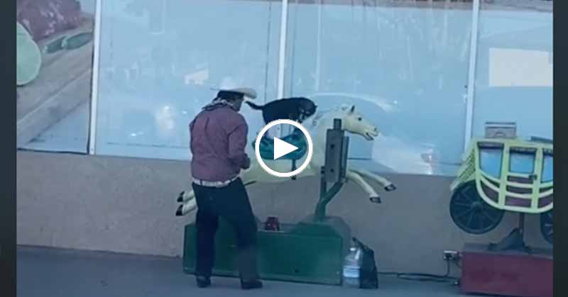 El perrito se divertía en el juego mecánico mientras su dueño bailaba junto a él para cuidarlo