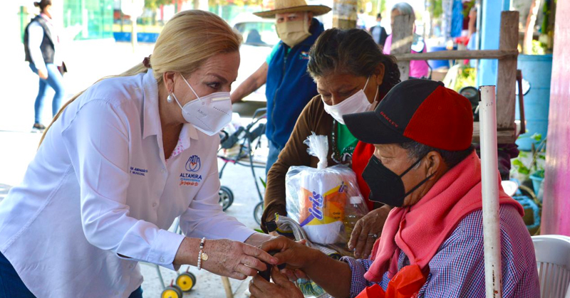En atención al programa Adulto Activo, alcaldesa y presidenta del DIF Altamira entregan paquetes alimenticios en los sectores 2 y 3 de la colonia Altamira, así como en el Fraccionamiento Arboledas y en La Pedrera