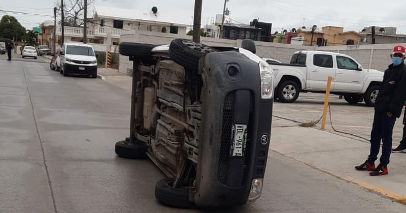 Una camioneta en color blanco y un auto, se desplazaban a velocidad inmoderada, por lo que una mala maniobra generó que se impactaran, a causa del fuerte golpe la primera unidad quedó recostada sobre la calle Flores de la colonia Estadio.