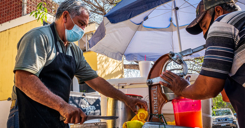«Si la vida te da limones, haz limonada», en el caso del señor Juan Martín son naranjas y toronjas las que él exprime para vender sus jugos desde hace 20 años en el bulevar López Mateos, frente a Walmart Adelitas.