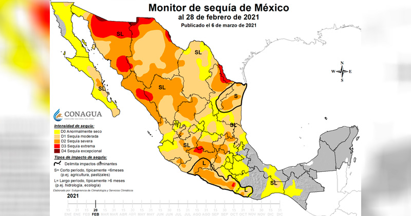De acuerdo con el SMN el área afectada por la falta de lluvias incrementó en partes de Durango y Sinaloa, oriente y centro del país, así como algunas regiones de Chiapas y Veracruz.