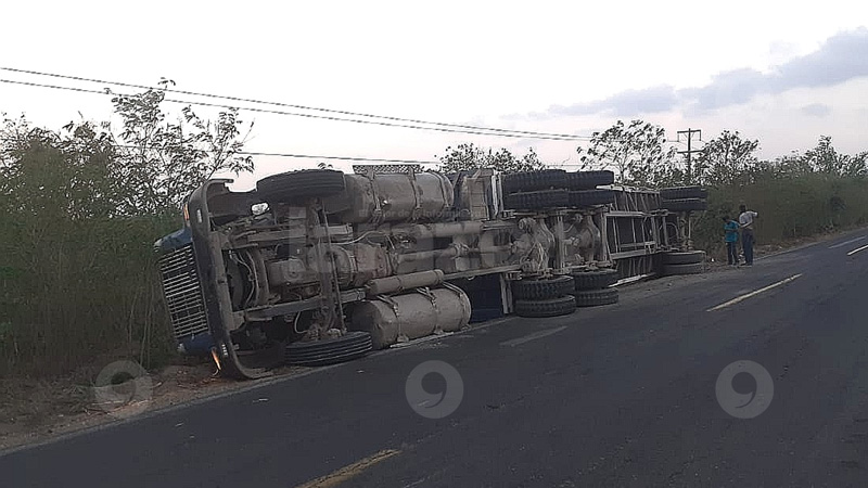 La pesada unidad cargada de caña termina recostada a un lado de la carretera Alazán-Canoas