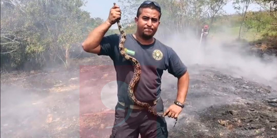 Una Boa Centroamericana, fue rescatada por los bomberos durante el incendio de pastizal que se registró este jueves en Ciudad Madero.