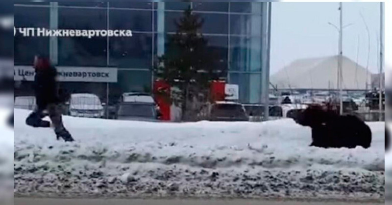 Hombre escapa corriendo de un oso en calles de una ciudad rusa