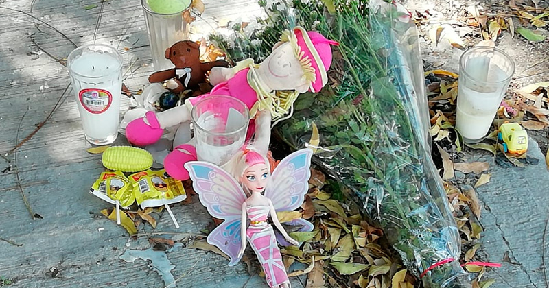 ALTAMIRA, TAMAULIPAS.- Una muñeca de Rosita Fresita, una hada, un oso de peluche, una pelota de tenis, dos carritos y dos paletas de dulce fueron colocadas por los vecinos como ofrenda a Alexis de 8 años y a Mónica de 5 años.