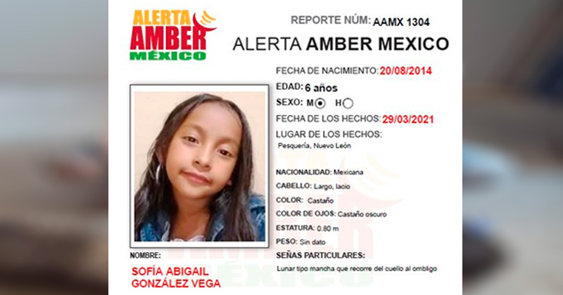 Se activa Alerta Amber por la menor Sofía Abigail González Vega, de 6 años de edad. Requerimos de su apoyo para encontrarla. Por favor, ¡comparte! #AlertaAmber pic.twitter.com/xNZXTfmniQ