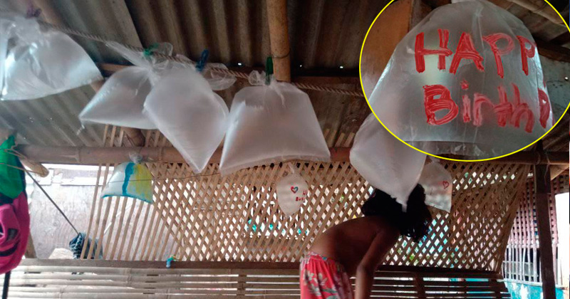 Niños organizan fiesta con bolsas como globos para el cumpleaños de su papá