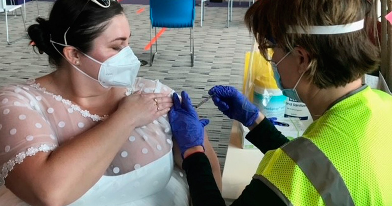 Acudió a vacunarse con su vestido de novia