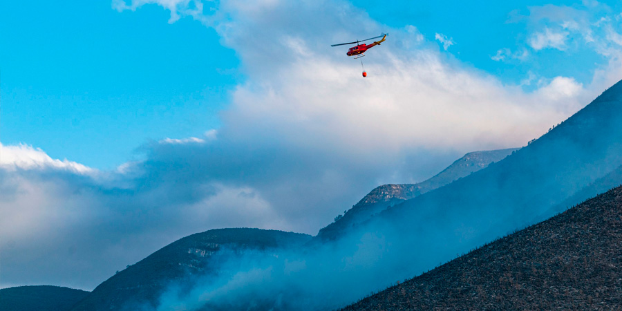 La conflagración fuera de control, ha devastado 3 mil 085 hectáreas en Miquihuana; el fuego está cerca de comunidades, por lo que apoyan con helicópteros para sofocarlo