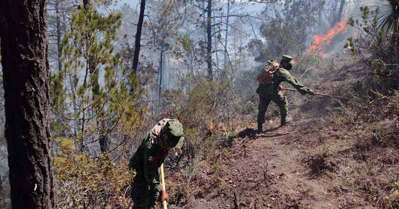 Elementos de la Sedena se sumaron en apoyo para combatir el fuego que ha consumido 3 mil 200 hectáreas y acecha zonas pobladas de la cabecera.