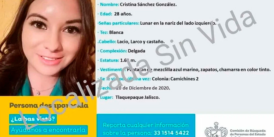 El cuerpo sin vida de Cristina Sánchez González, de 28 años de edad, fue hallado por sus familiares luego de permanecer desaparecida desde el pasado 20 de diciembre