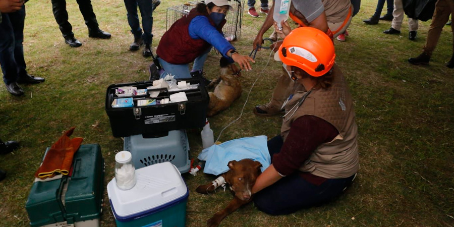 A pesar de una fuerte lluvia, elementos de seguridad lograron rescatar a los dos perros que se encontraba atrapado en el socavón