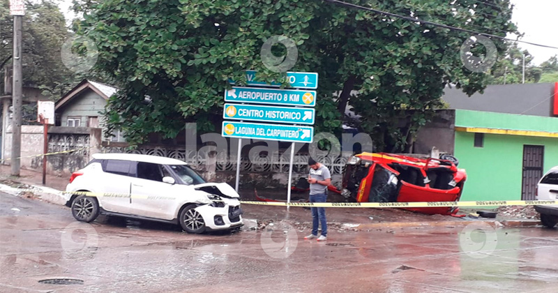 Un auto Susuki Swift color blanco y un Chevrolet Spark rojo habilitado como taxi.