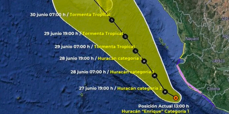 Enrique se desplaza hacia el norte a una velocidad de 13 kilómetros por hora. Presenta vientos máximos sostenidos de 148 kilómetros por hora, y rachas de 185 km/h.