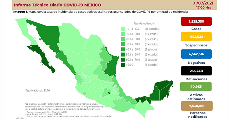 El número de muertes a causa de covid-19 llegó a 233 mil 248, debido a la ocurrencia de 201 defunciones más