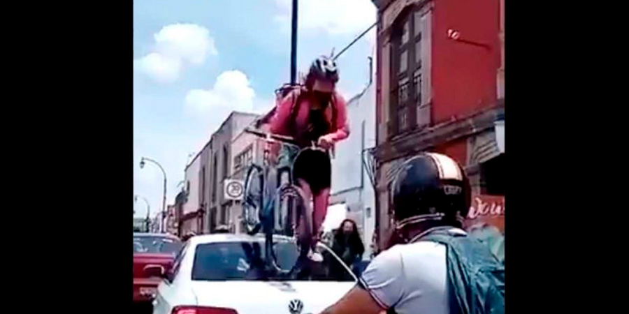 Ciclista pasa por encima de un auto que no respetó la ciclovía