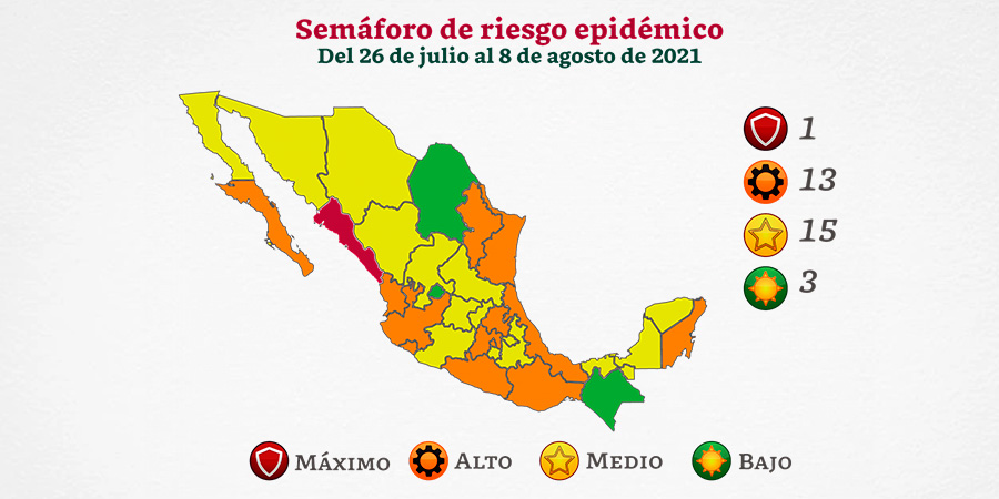 La Secretaría de Salud actualizó ayer el semáforo de riesgo epidémico que colocó a una entidad en color rojo, 13 en naranja, 15 en amarillo y 3 en verde.