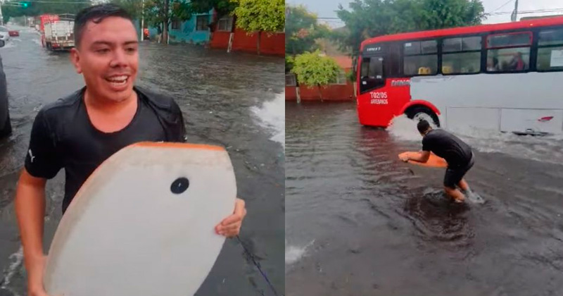 El hombre aprovechaba el oleaje que provocaban los autobuses a su paso para lanzarse al agua