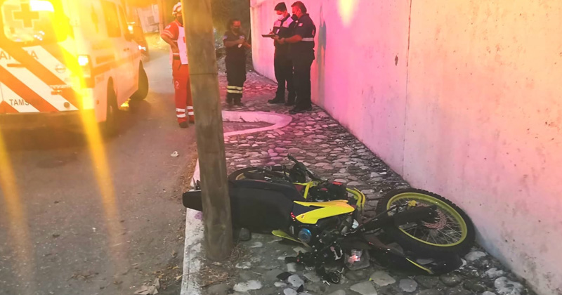 Tampico.- Graves lesiones sufrieron un motociclista y su acompañante al estrellarse su vehículo contra un poste de madera y posteriormente con una barda, la mañana del lunes.