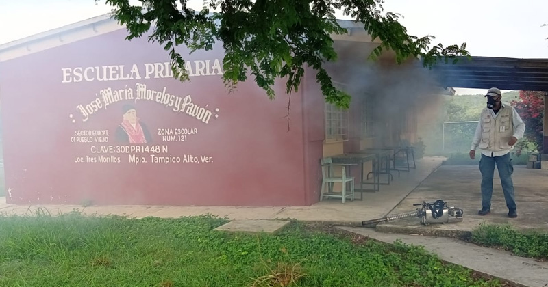 Tampico Alto.- Con la visita de los planteles educativos ubicados en la Costa de Cabo Rojo, en una cuarta jornada de un trabajo intensivo y titánico se logró la fumigación contra el dengue de los 70 planteles educativos del municipio. que ya se encuentran listos para el regreso a clases.