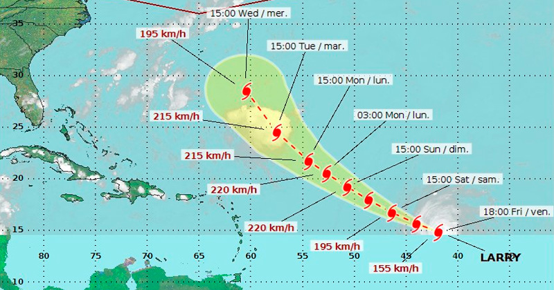 Actualmente, el huracán Larry ya alcanzó la categoría 1 en la escala Saffir-Simpson y se ubica a más de 5 mil km al este de las costas de Quintana Roo.