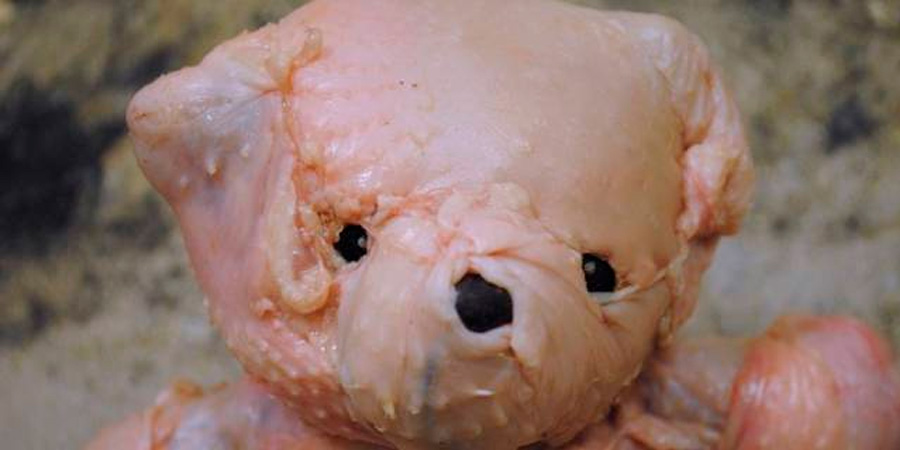 ¿Comprarías un oso hecho con retazo de pollo? El vendedor asegura que es ideal para jugar y después comerse.