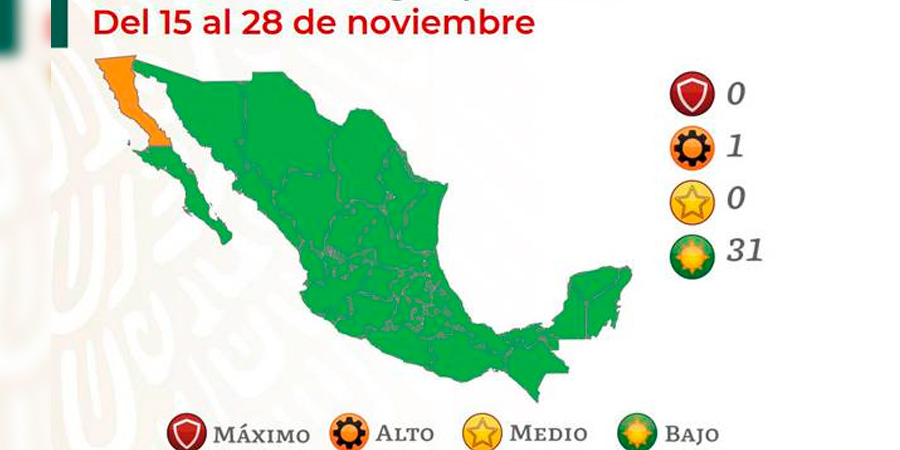 Salvo Baja California, todos los estados se ubicarán en el semáforo Covid-19 verde durante la siguiente quincena.