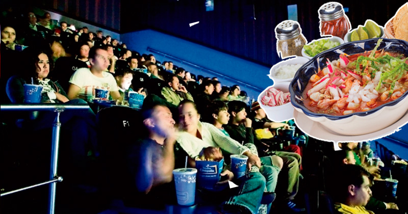 Familia mete olla de pozole para comer en la sala de cine