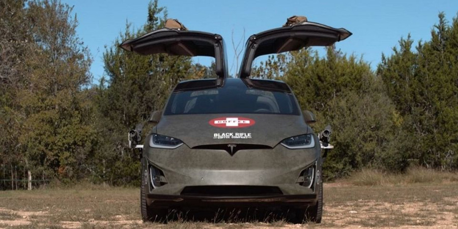 Modifican auto Tesla y lo equipan con dos ametralladoras