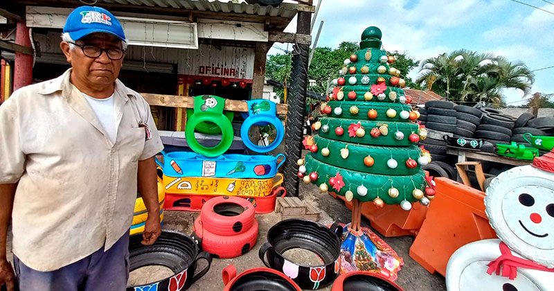 Don Toribio Espinoza Cruz de oficio vulcanizador señaló que tiene muchos años trabajando, pero debido a la gran cantidad de llantas inservibles que le dejaban, decidió junto con su familia empezar a realizar figuras decorativas y así reciclar.