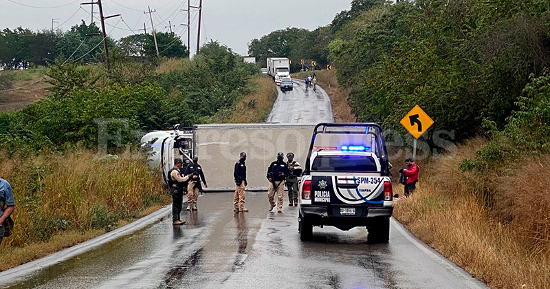 Tempoal, Ver.- Debido a las lluvias registradas durante el domingo, un tráiler con caja terminó volcado en la carretera federal Alazán – Canoas cerca del Rancho denominada los 14, a las 11 de la mañana.