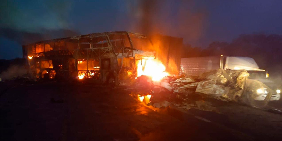 El encontronazo ocurrió cerca de San Fernando y la unidad de Transpaís ardió al ocurrir el impacto que también afectó a una camioneta Pacífico; hay cinco muertos y 21 heridos