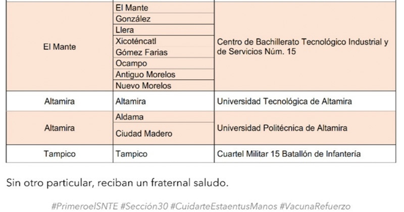 Altamira, sede de vacunación de los maestros de Madero, Aldama y Altamira