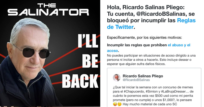 Esta mañana, la cuenta de Twitter de Ricardo Salinas Pliego fue suspendida debido a prácticas de acoso dentro de la plataforma.