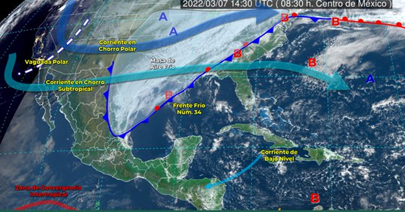 El Frente Frío Número 34 se desplazará sobre el noreste de México, y en interacción con canales de baja presión en el oriente del país y el sur del Golfo de México provocará chubascos y bajas temperaturas