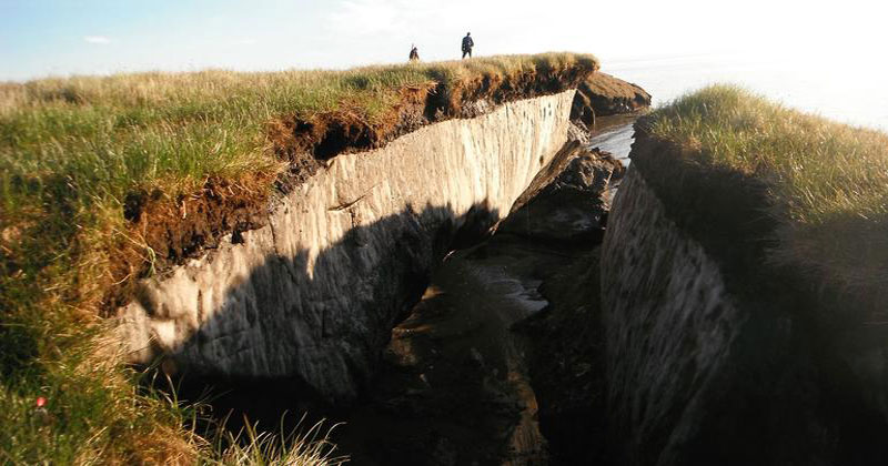 El deshielo de la escarcha en los polos puede resultar en la pérdida de terreno; los acantilados costeros en Alaska se están derrumbando hacia el océano