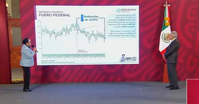 Rosa Icela Rodríguez, secretaria de Seguridad y Protección Ciudadana, informó que en los últimos 9 meses se registró una tendencia a la baja en la mayoría de los delitos federales
