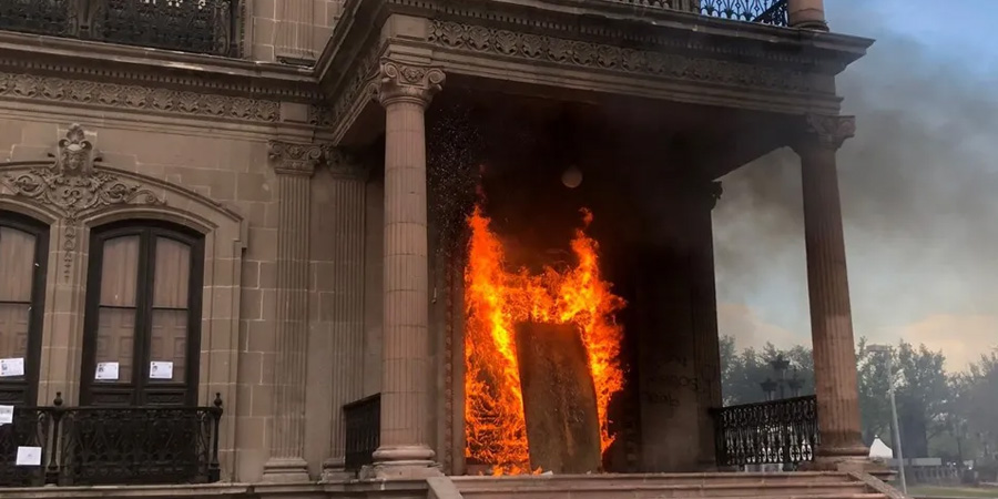 Prenden fuego a las puertas del palacio de Gobierno de Nuevo León