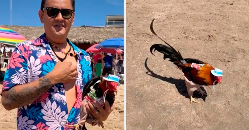Consiente a su gallo y se lo lleva de vacaciones a la playa