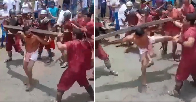 Un hombre que interpretaba a Jesucristo en una representación de la Pasión de Cristo enfureció contra soldados romanos que no dejaban de lanzarle azotes y así los golpeó.